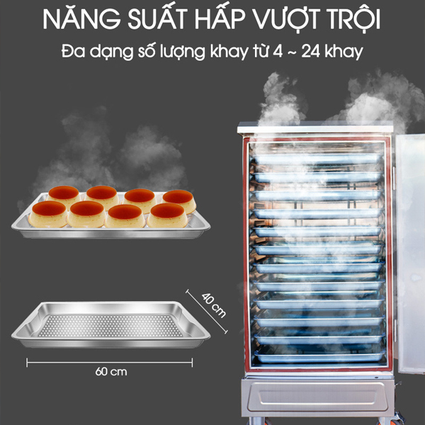 Tủ hấp bánh flan rất đa dạng về mức năng suất dựa theo số khay của mỗi loại tủ: 4 khay, 6 khay, 8 khay, 10 khay, 12 khay, 24 khay. Bạn có thể ước chừng số bánh flan hấp trên mỗi khay dựa theo kích thước khay là 400x600mm. Tiệm bánh của bạn quy mô nhỏ hay lớn thì sẽ đều có một loại tủ với mức năng suất/số khay phù hợp nhất để lựa chọn.